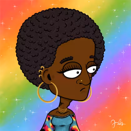Collection Depressed Citizens Artist Juls Description ART. No team, no project, no future. Depressed Citizens is an urban & existential Art expression on Ordinals. In a parallel universe, "THEI" control us. DC unites against toxic society, encouraging critical thinking. 100% hand made collection that took Juls more than 6 months of daily work. Name Citizen#297 Origin LGBT-Q+ Gender Trans Necklace Gold layered necklace Hat No Hat Mustache Beard No beard Glasses No Glasses Earrings Helix ring trio Hair Style Afro Clothes Abstract flowers blue blouse Tattoo Dragon tattoo Star Background With stars