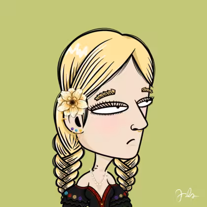 Collection Depressed Citizens Artist Juls Description ART. No team, no project, no future. Depressed Citizens is an urban & existential Art expression on Ordinals. In a parallel universe, "THEI" control us. DC unites against toxic society, encouraging critical thinking. 100% hand made collection that took Juls more than 6 months of daily work. Name Citizen#1294 Origin Unique Gender Woman Necklace Pearl necklace Hat No Hat Mustache Beard No beard Glasses No Glasses Earrings Helix ring trio Hair Style Double braids Clothes Traditional black flowery dress Tattoo Rose tattoo Star Background Without stars