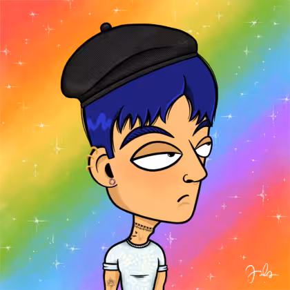 Collection Depressed Citizens Artist Juls Description ART. No team, no project, no future. Depressed Citizens is an urban & existential Art expression on Ordinals. In a parallel universe, "THEI" control us. DC unites against toxic society, encouraging critical thinking. 100% hand made collection that took Juls more than 6 months of daily work. Name Citizen#646 Origin LGBT-Q+ Gender Non-binary Necklace Choker Hat Black beret Mustache Beard No beard Glasses No Glasses Earrings Helix ring trio Hair Style Short pixie Clothes I'm cool slim T-shirt Tattoo Rose tattoo Star Background With stars
