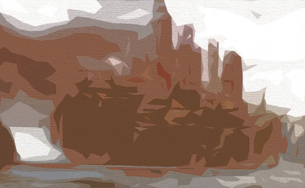 Each piece begins with original landscape photography, transformed through GAN-based machine learning into abstract terrains, then manually refined into simplified digital compositions. The final works are inscribed onto satoshis shared with cursed ordinals deemed valueless—cursed, floored, and rejected.